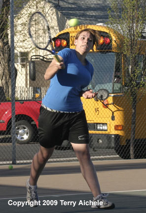 LEFT - Micah Admire serves during her doubles match on Monday. Her and teammate Angel Cole lost to Kirysa Koch and Rachel Smith of MacHi. RIGHT - Angel Cole prepares to hit a return during her doubles match on Monday.